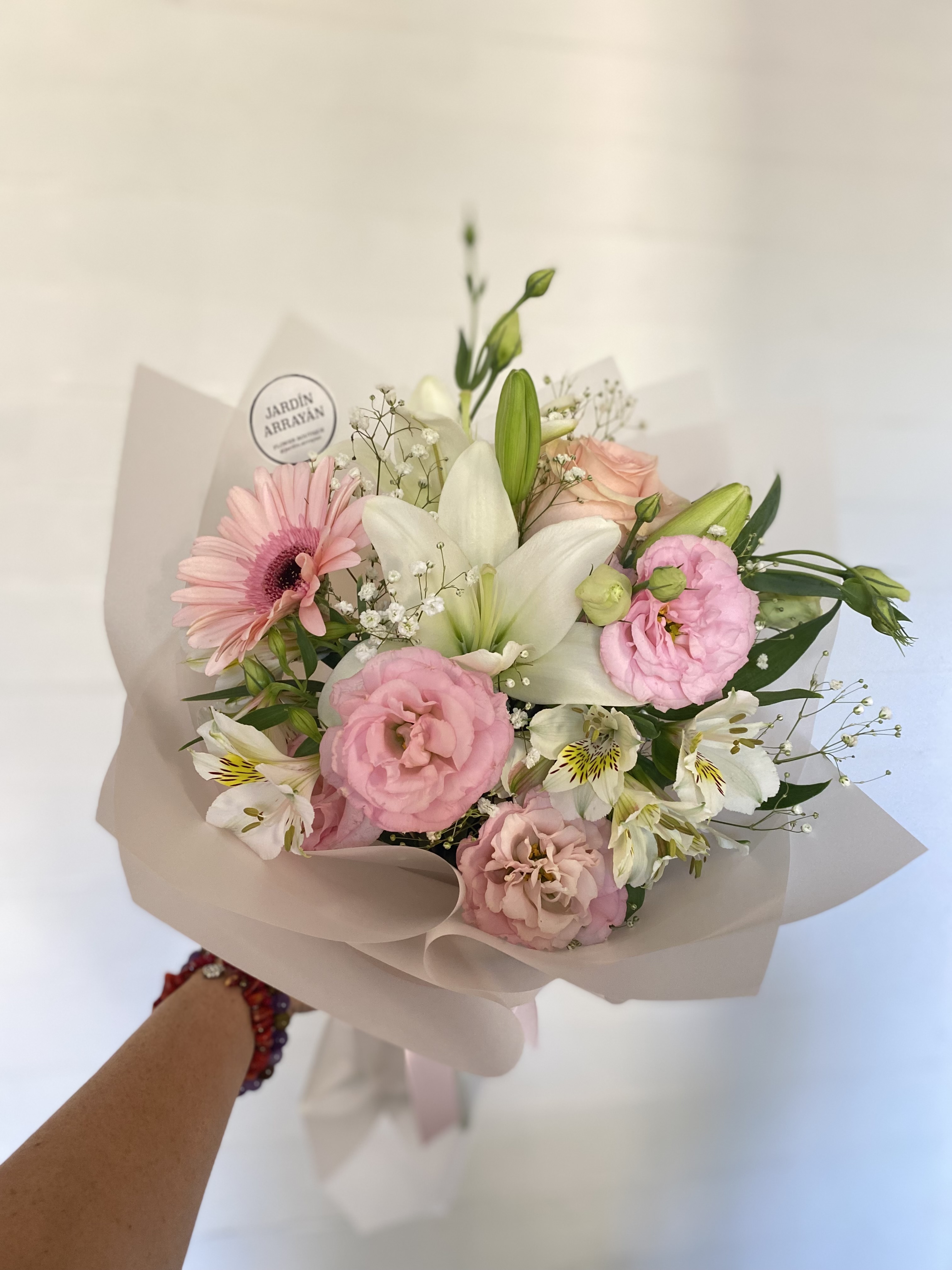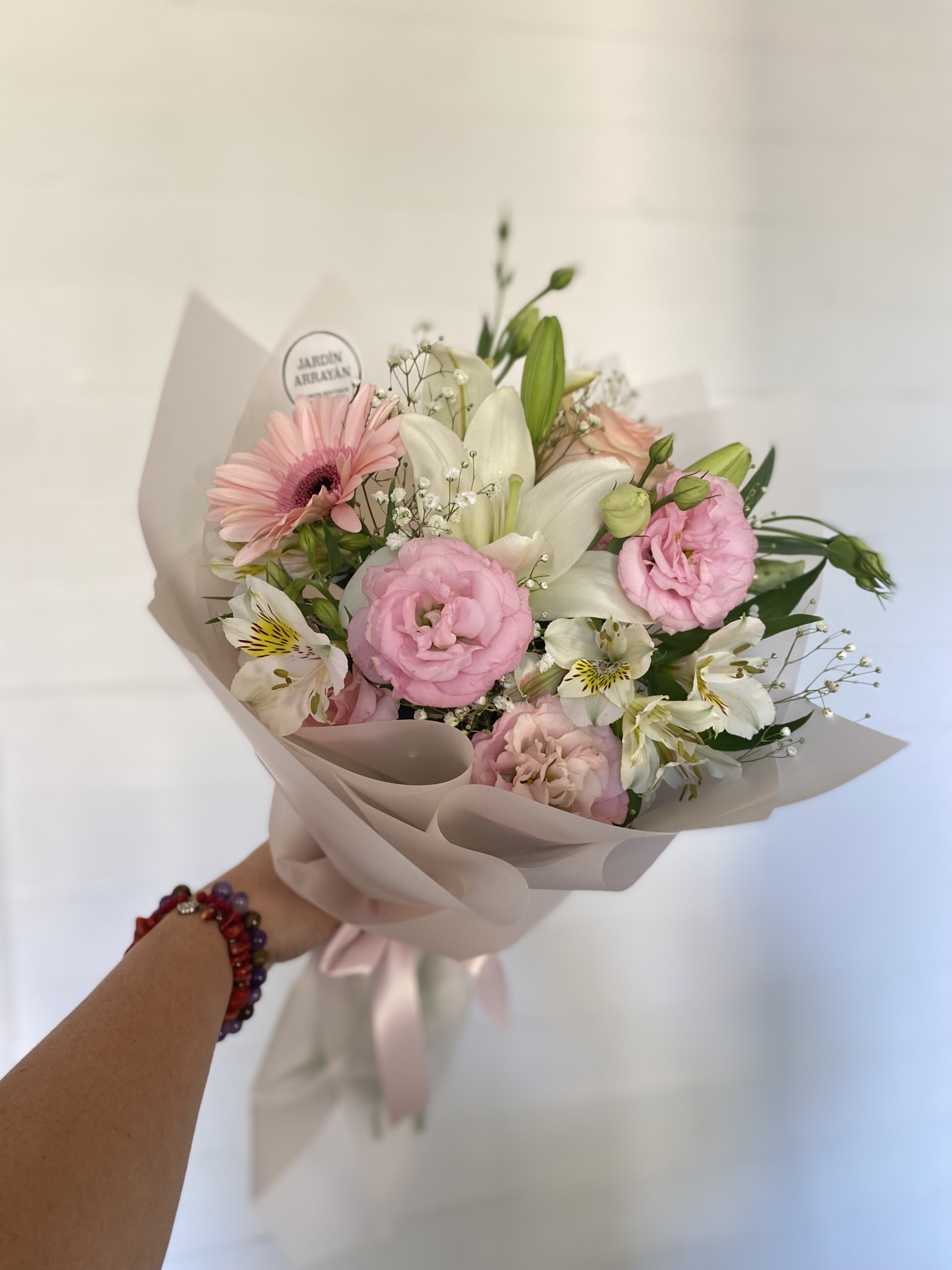 Descubre nuestro elegante ramo en tonos rosados con delicados toques blancos. Este ramo no solo destaca por su belleza, sino también por la suavidad de sus pétalos, lo que lo convierte en una opción ideal para cualquier ocasión especial. Su diseño cuidadosamente elaborado aporta un toque de frescura y sofisticación a tu decoración.