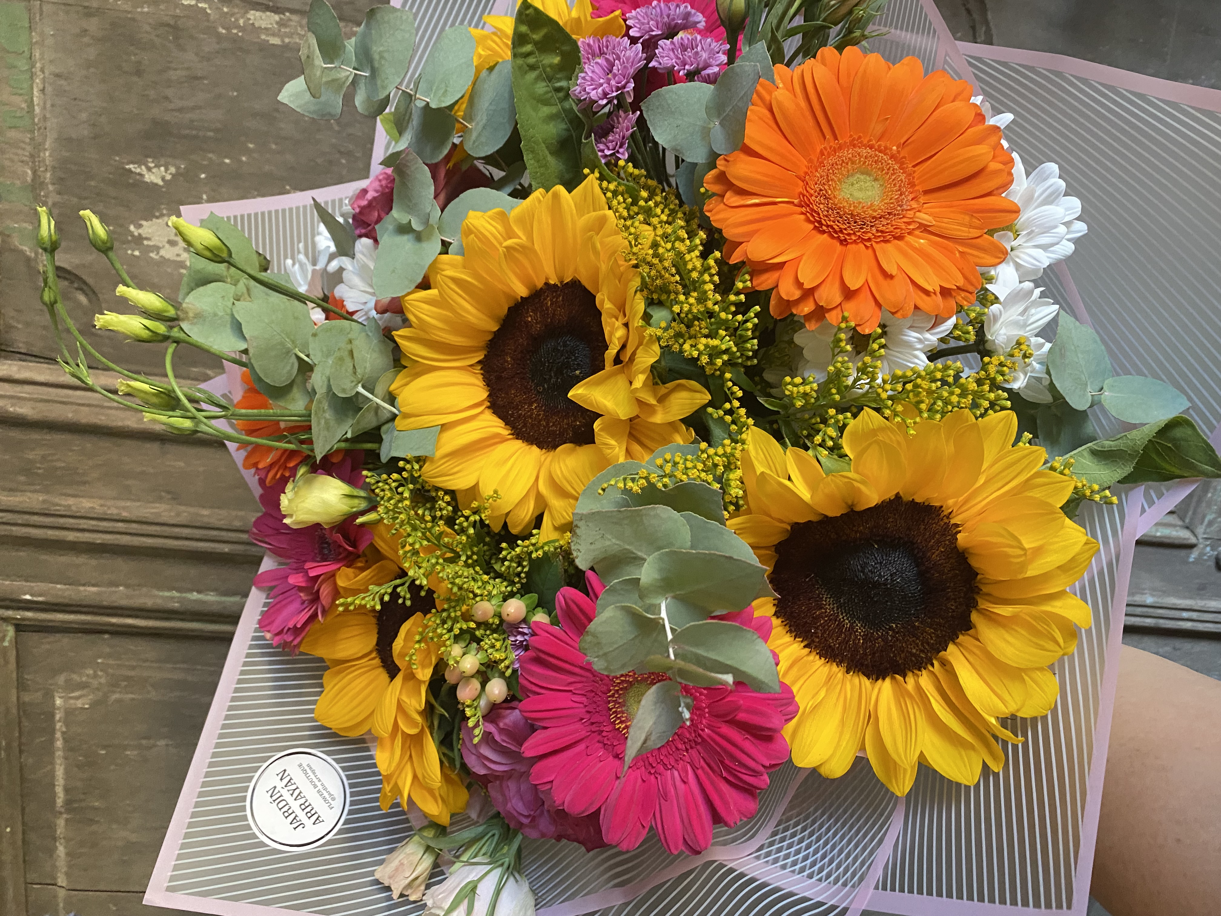 Ramo "Intensidad Grande" es una opción vibrante y alegre que combina diversas flores de colores intensos, destacando el girasol y las gerberas como flores principales. Este ramo es perfecto para alegrar cualquier ocasión, ya sea un cumpleaños, un aniversario o simplemente para dar un toque de color a tu hogar.