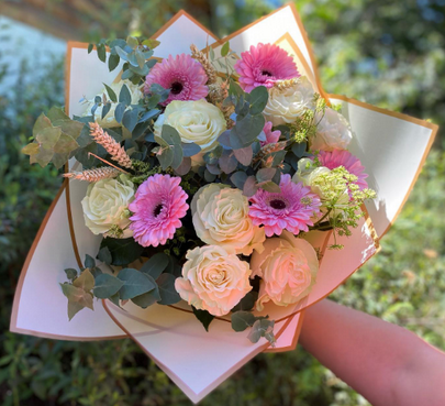 Ramo grande de rosas y gerberas rosadas con eucaliptus, pensado para quien busca un arreglo elegante y con gran presencia. Combina la suavidad y romanticismo de las rosas con el color vibrante de las gerberas, realzado por el follaje aromático del eucaliptus.