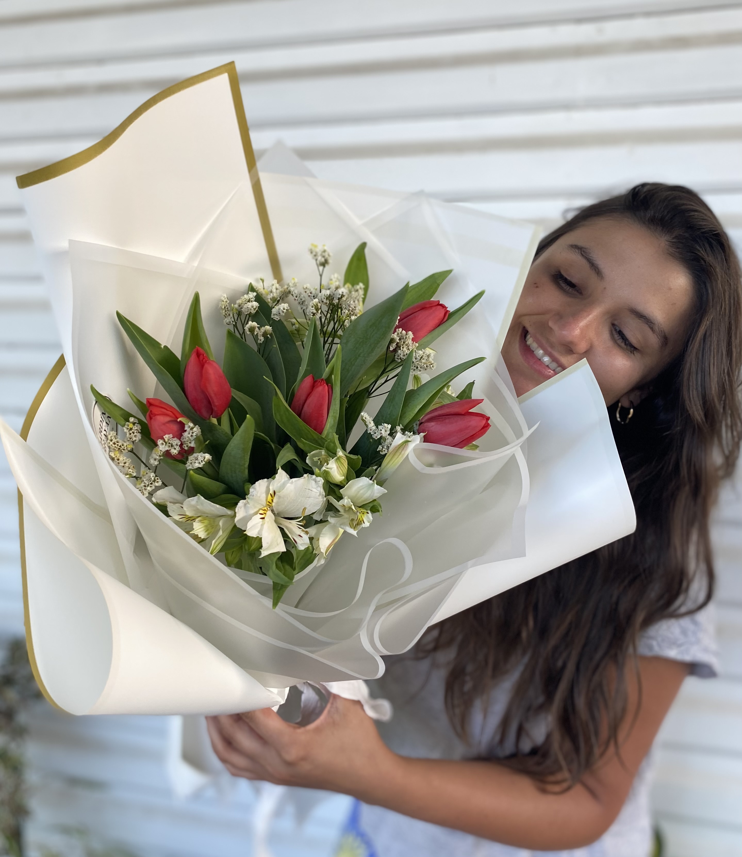 Descubre nuestro hermoso ramo frontal de tulipanes, que incluye 5 varas en tono rojo, complementadas con adorables alstromelias. Este diseño elegantemente dispuesto es perfecto para añadir un toque de color y frescura a cualquier espacio. La combinación de tulipanes y alstromelias no solo resalta la belleza natural de las flores, sino que también ofrece una fragancia encantadora que revitaliza el ambiente.